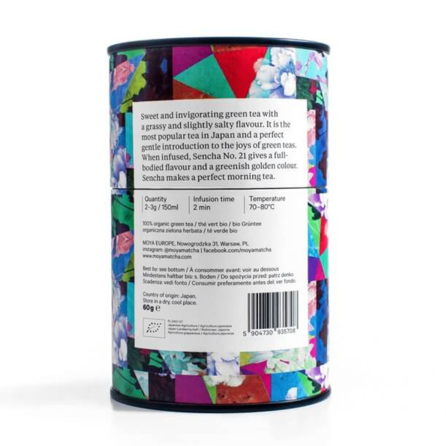 Sencha er vinsælasta teið í Japan og það er líka frægasta græna teið í heiminum. Teið hefur milt, sætt og mjög frískandi bragð, með smjörkenndum, grösugum keim og grængulum lit. Orðið „sencha“ þýðir bókstaflega „lagað við lágan hita“ og það vísar til dæmigerðrar lögunar á lauftei sem felur í sér að hella heitu vatni yfir þurr laufblöð. Þetta te gefur frá sér besta bragðið þegar það er lagað með mjúku vatni með lágu pH gildi. Moya Sencha nr. 21 er lífrænt ræktað á eyjunni Kyushu.