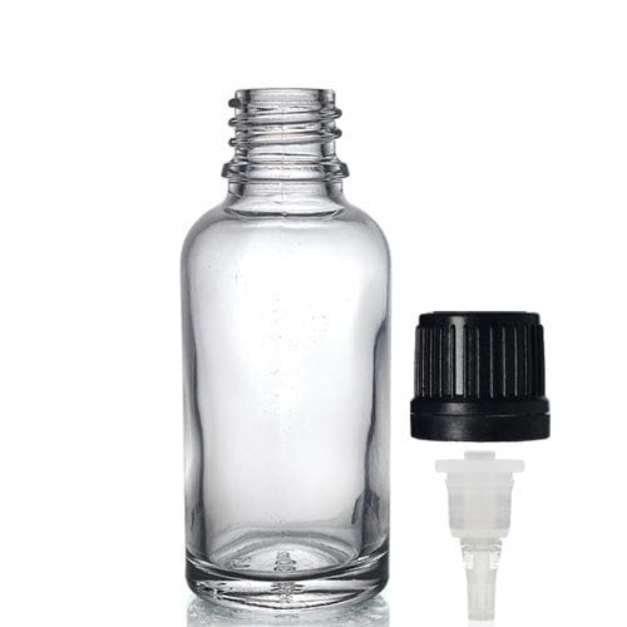 30 ml glært glerglas. Kemur með dropateljara og loki úr plasti en að auki er hægt að fá pípettu fyrir 30 ml glös hér.