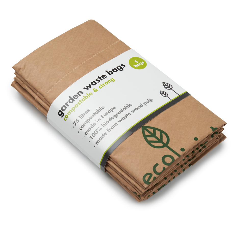 5 stk. af jarðgeranlegum pappírspokum sem rúma allt að 75 ltr. Extra sterkur og tveggja laga garðaúrgangspoki með flötum botni. Pokinn er úr kraftpappír sem framleiddur er í Evrópu úr afgangs timburmassa og afskurði.
