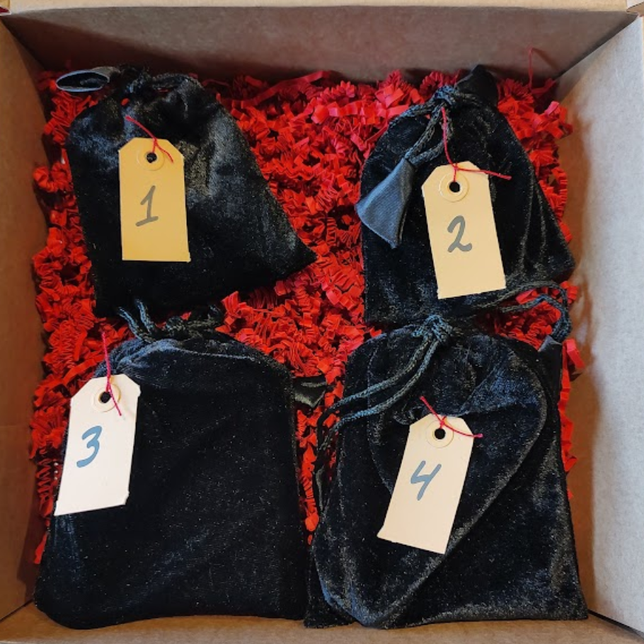 Fengum aðeins örfáa kassa en hver þeirra inniheldur fjóra flauelspoka og opna má einn poka á hverjum sunnudegi á aðventunni. Hver poki inniheldur eitthvað skemmtilegt sem hentar fyrir nornir.
