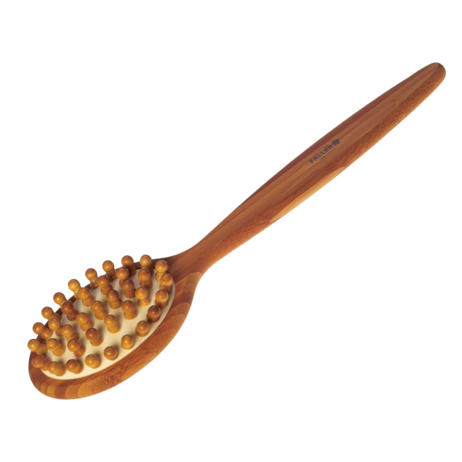 Fallegur bað og nuddbursti úr bambus með gúmmípúða og fimm röðum af viðarnuddpinnum. FSC 100%*