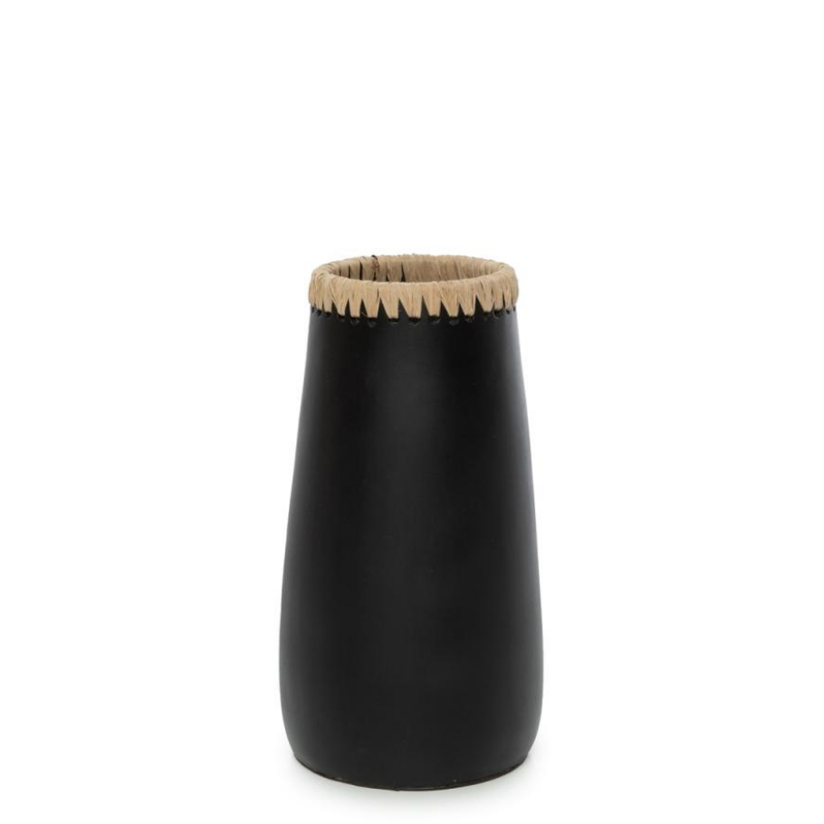 Ef þig langar að fegra stofuna, baðherbergið eða önnur rými með blómum, hvort heldur þurrkuðum eða afskornum og rýmið er af skornum skammti er hægt að hafa vasann ílangan eins og þessa. Vasinn er úr terrakotta leir með raffía strávafning til yndisauka á toppnum.
