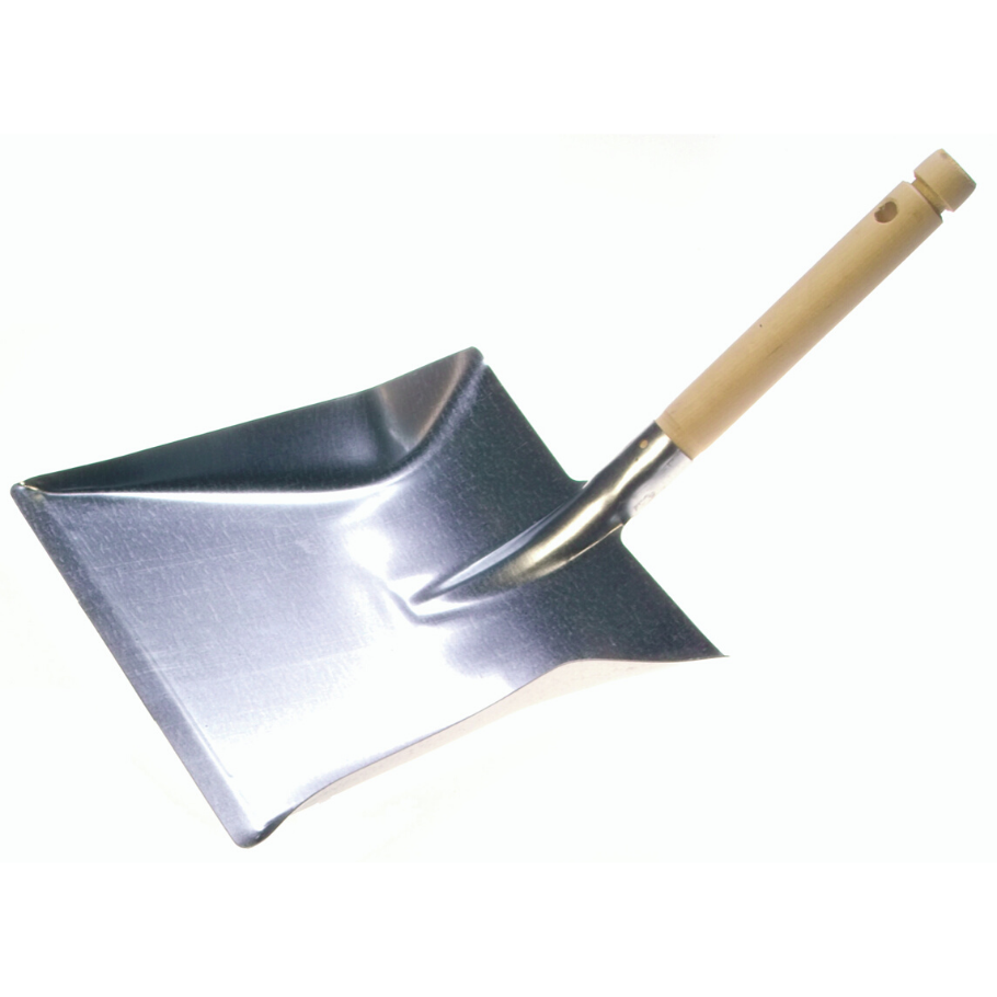Skemmtilega gamaldags fægiskófla úr galvaníseruðum málmi með viðarhandfangi.