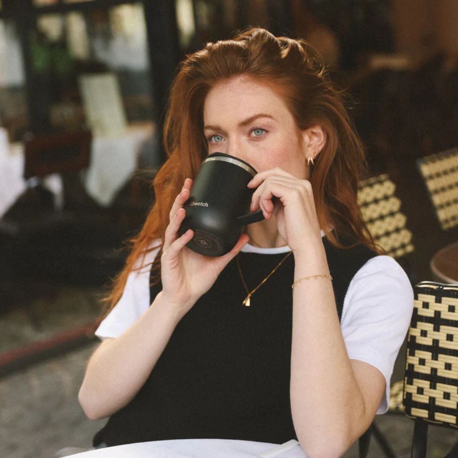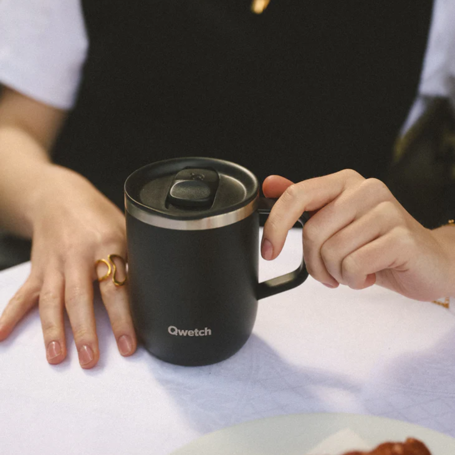 Ferðamál með handfangi og sem heldur bæði heitu og köldu. Bollinn er úr 90% endurunnu stáli og lokið á bollanum er með þægilegum sleða til að opna og loka drykkjaropinu.