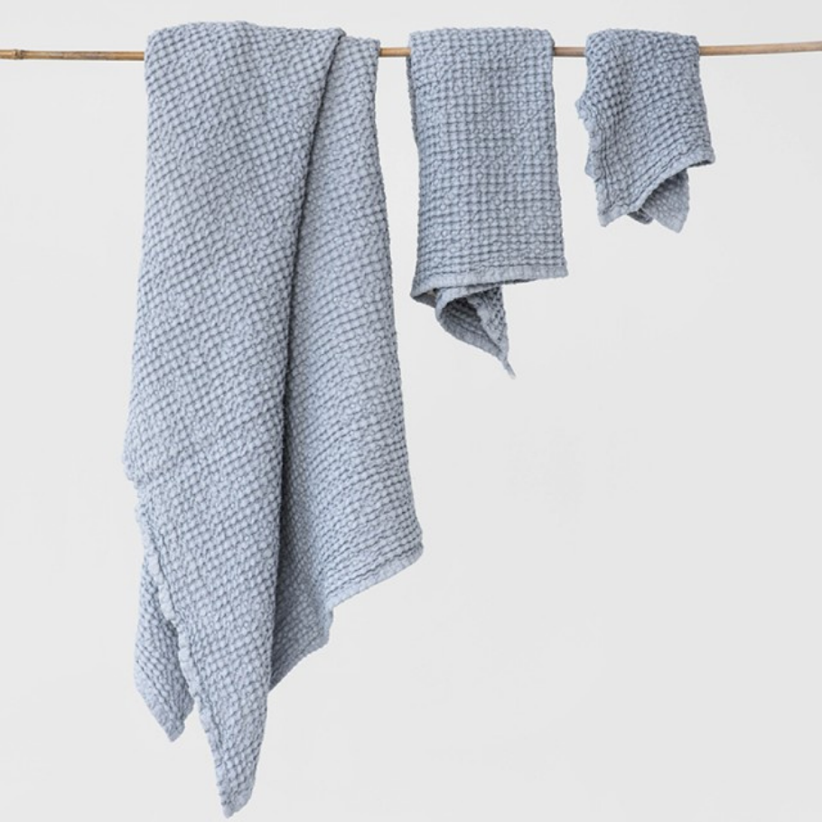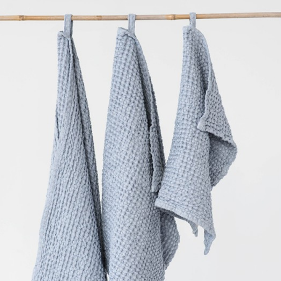 Púffý vöffluvefnaðurinn í handklæðunum eykur ekki aðeins rakdrægni handklæðanna heldur veitir hann húðinni líka mjúka þurrburstun um leið og þú þurrkar þér. Hör hefur örverudrepandi eiginleika frá náttúrunnar hendi. Þeir eiginleika ásamt vöffluvefnaðinum gerir það að verkum að handklæðið þornar hratt sem kemur í veg fyrir myglu, örverur og vonda lykt.