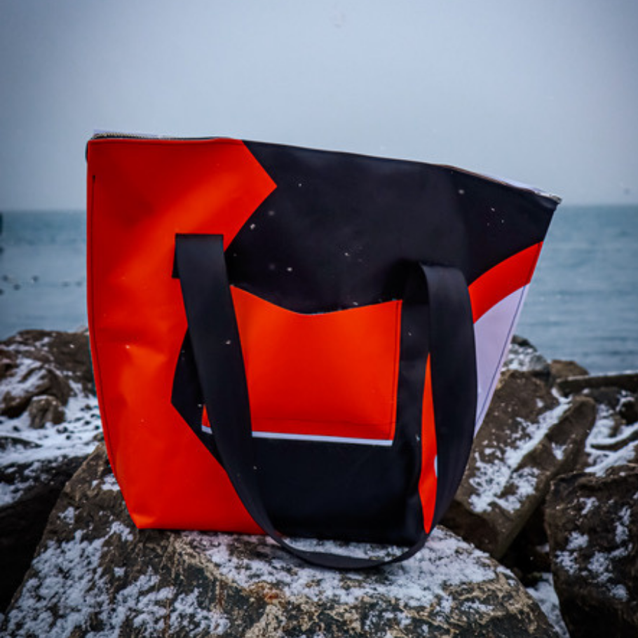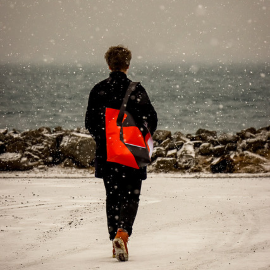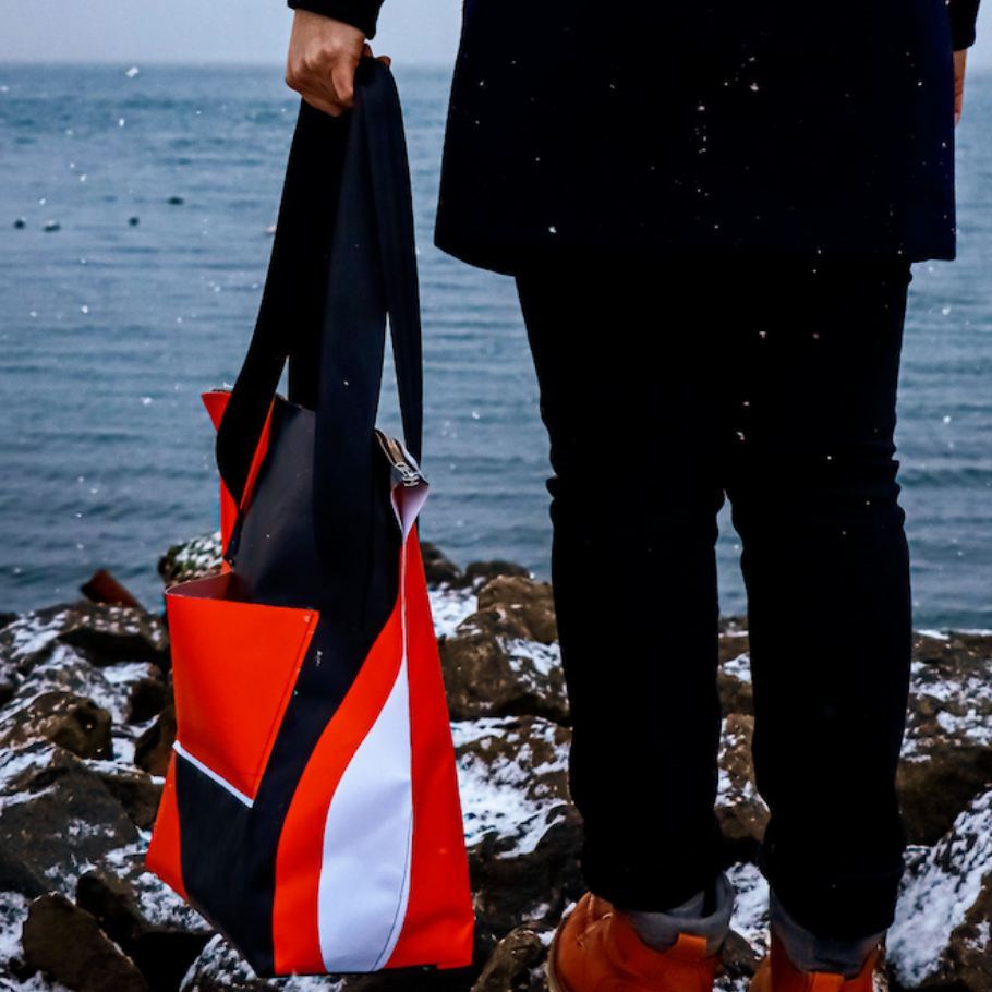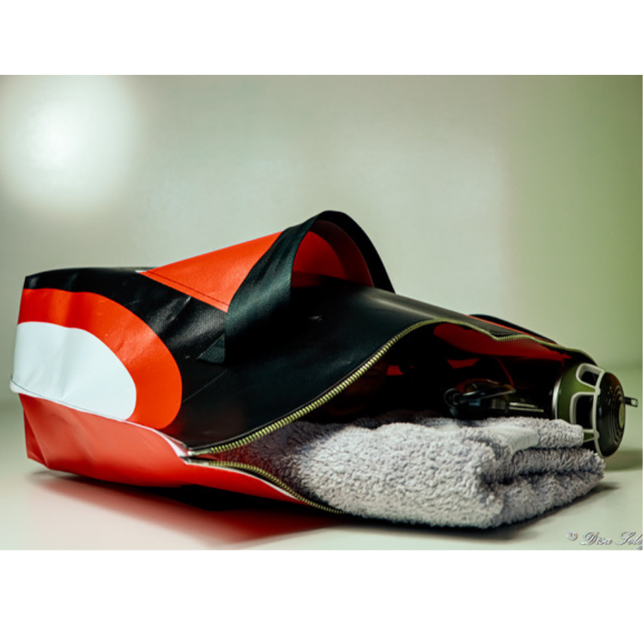 Taskan er 50x50cm á stærð og passar til dæmis fullkomlega í sundlauga-skápinn, undir blaut föt af leikskólanum eða hvað sem er. Efnið er plasthúðað og endingargott og böndin eru úr bílbeltum frá förguðum bílum.