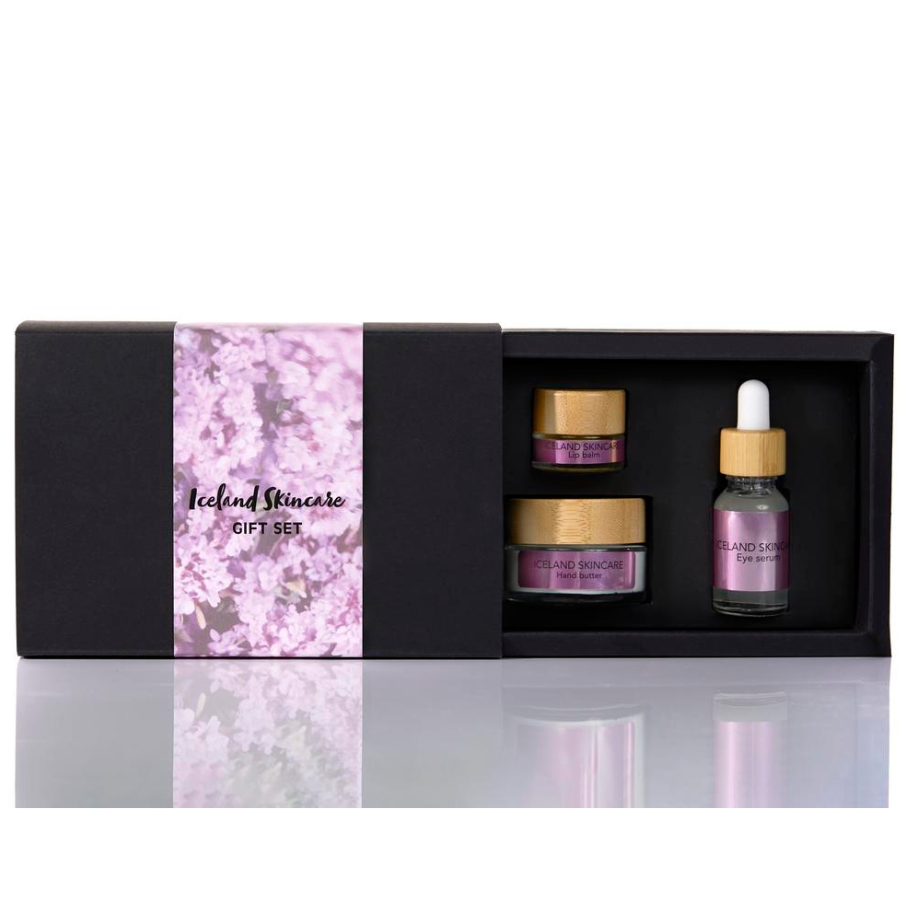Einstaklega fallegt gjafasett sem inniheldur þrjár vörur úr Iceland Skincare húðlínunni, nærandi handkrem, augnserum og varasalva.