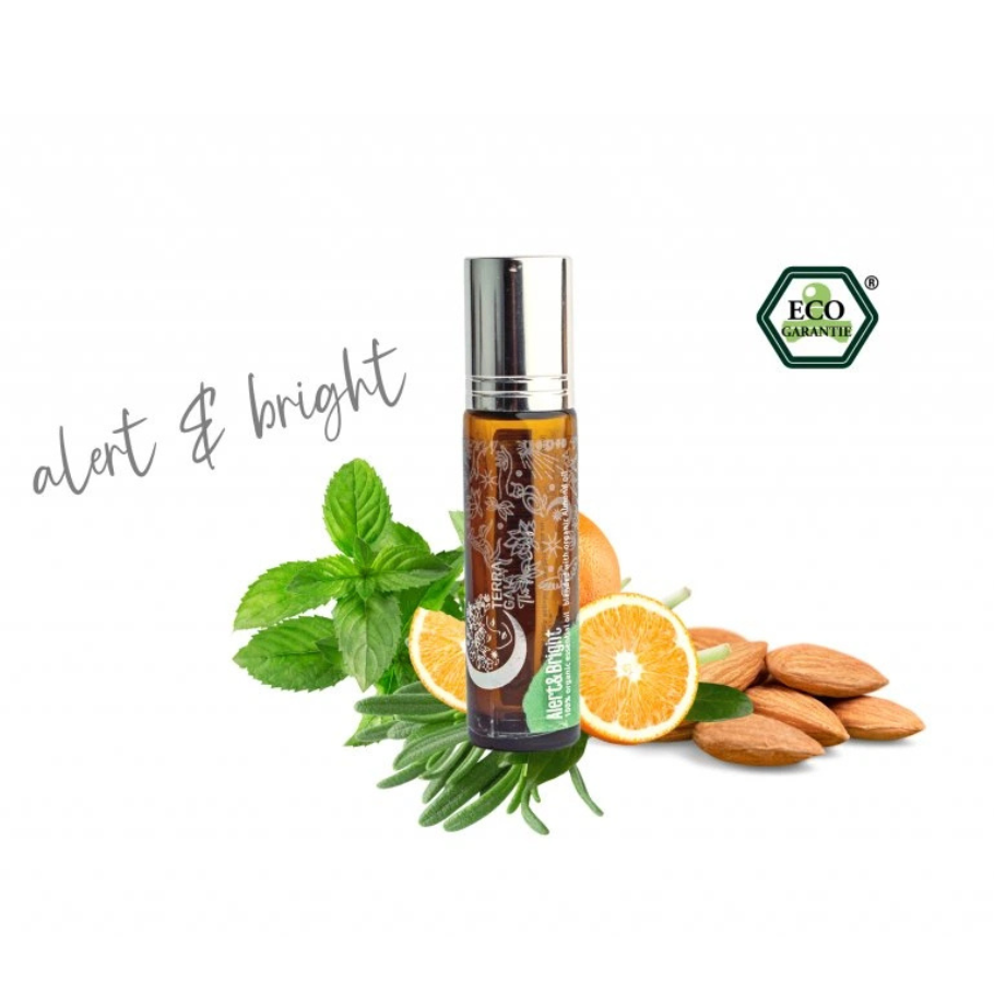 Upplífgandi roll-on blandan samanstendur af lífrænni möndluolíu og þremur lífrænum ilmkjarnaolíum: Appelsínu olíu til að draga úr streitu og létta lundina, piparmyntu olíu fyrir andlega árvekni og rósmarín olíu fyrir betri fókus og skýrleika.