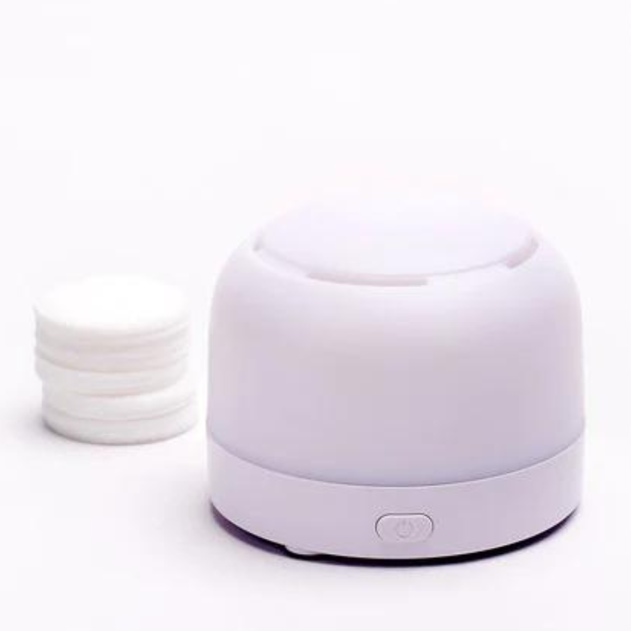 Boom er vatnslaus, rafknúin ilmdreifari með viftu, flíspúðum og ljósi.