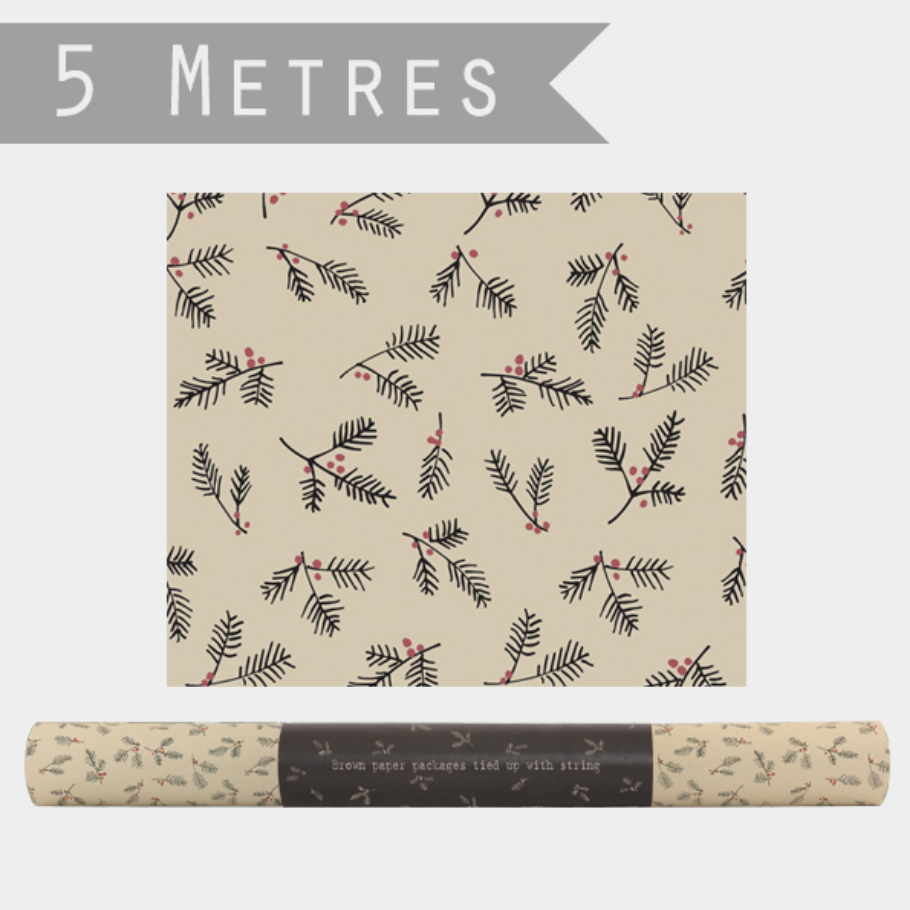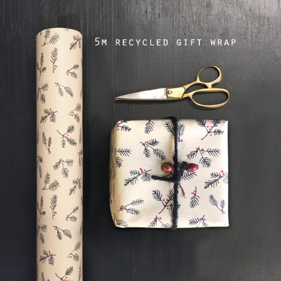 Fallegur jólapappír úr endurunnum kraftpappír. Ágætlega þykkur, með fínlegu greinamynstri.