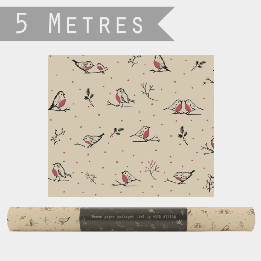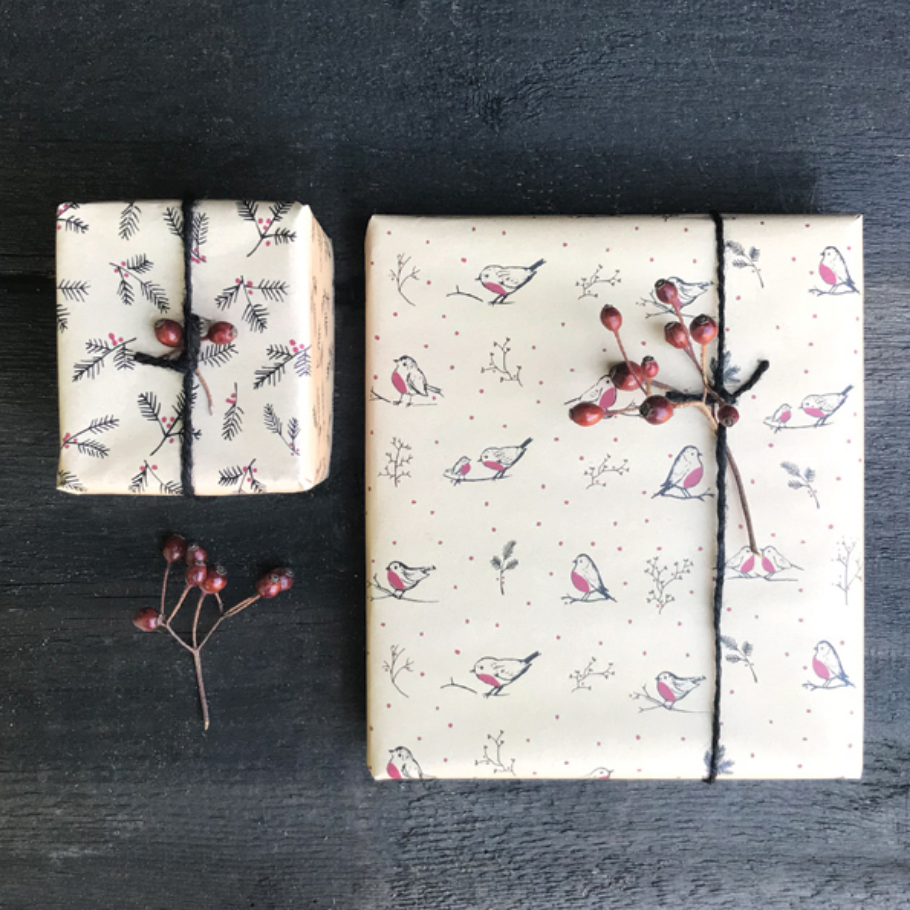 Fallegur jólapappír úr endurunnum kraftpappír. Ágætlega þykkur, með fínlegum greinum og glóbrystingi.