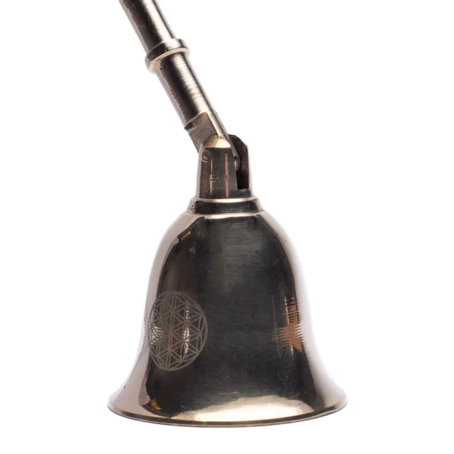Hefðbundinn, gylltur kertaslökkvari með táknmynd af blómi lífsins og viðarhandfangi.