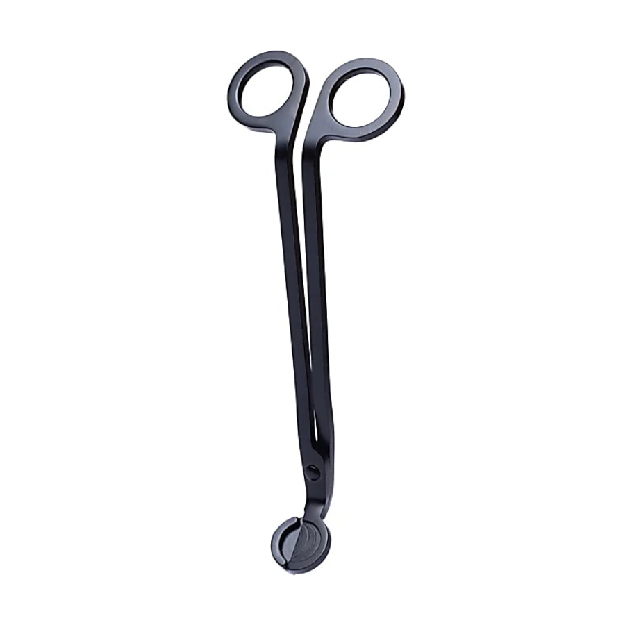 Stílhreint og fallegt svart kertasnyrtisett úr ryðfríu stáli. Settið inniheldur annars vegar löng skæri og hins vegar tvíþætt áhald sem er slétt í annan endann og með krók á hinum endanum.