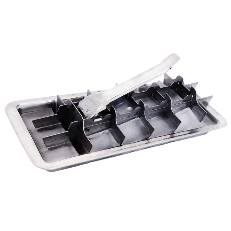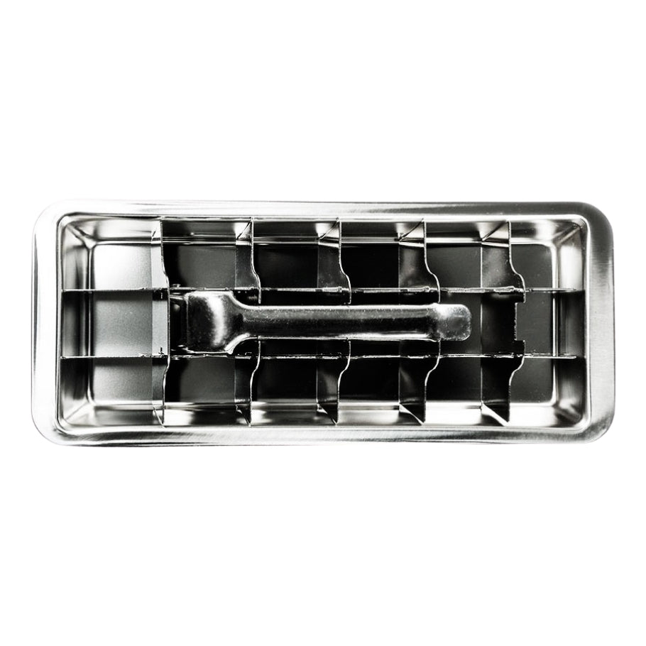 Klassískur ísmolabakki úr ryðfríu stáli, samþykktu fyrir matvæli. Með lausu skilrúmi og handfangi til að losa um klakana. Einfalt að þrífa og vinna með.
