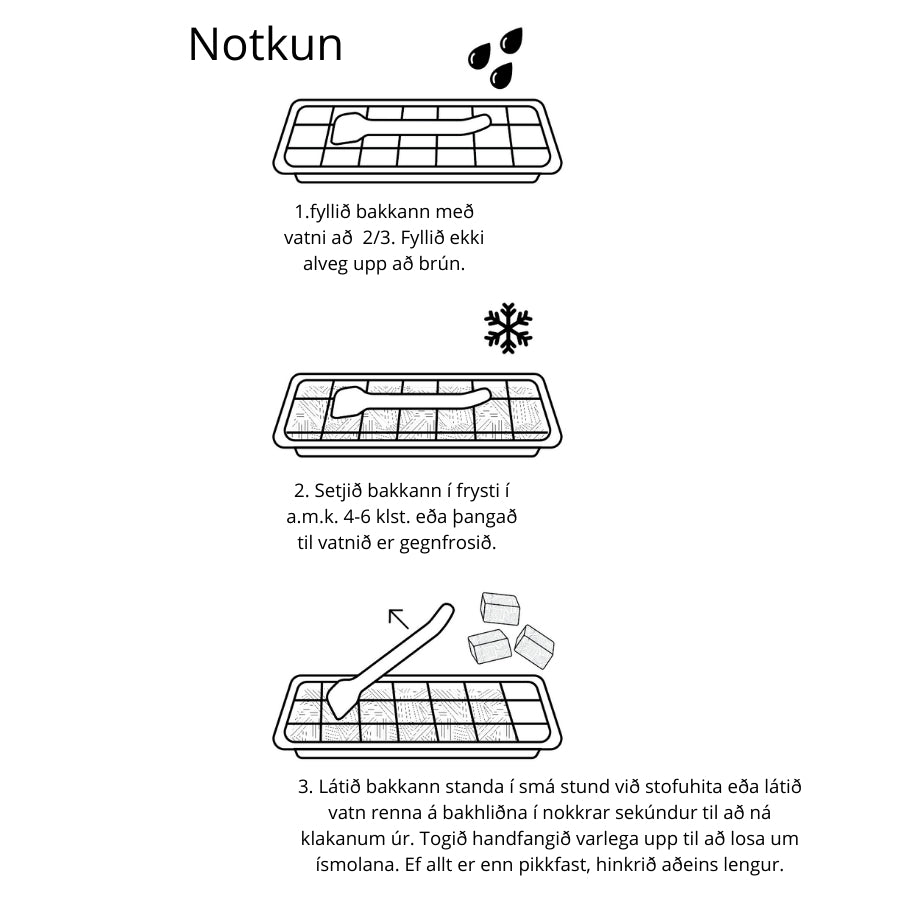 Notkun: Fyllið bakkann ekki alveg upp að brún þar sem vatnið þennst út við frost. Látið standa í nokkrar mínútur við stofuhita og/eða látið vatn renna á bakhliðina í nokkrar sek. til að losa örlítið um molana. Togið varlega í handfangið til að losa um klakana.