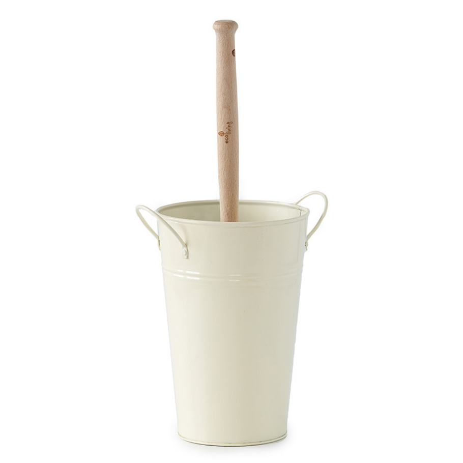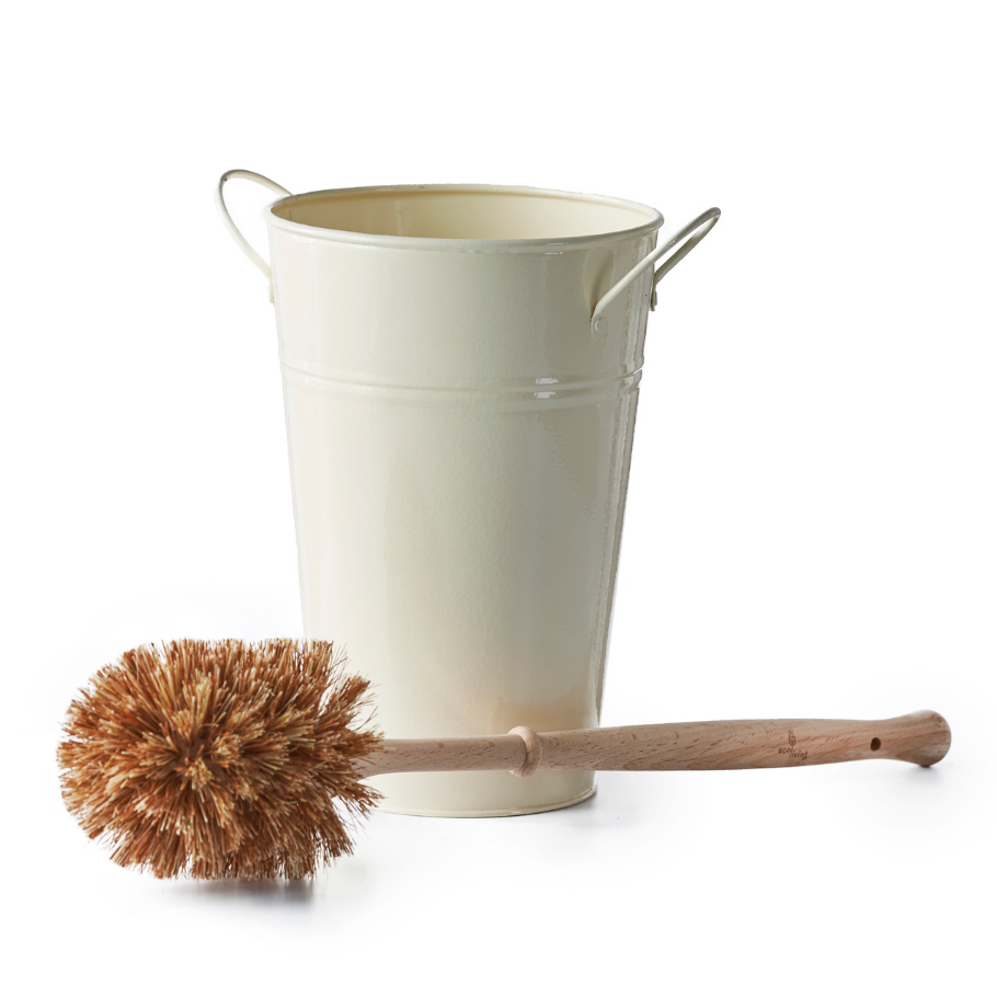 Algjörlega plastlaust klósettburstasett með bursta og fallegri fötu fyrir burstann. Burstinn er úr FSC vottuðu beyki og burstahárum úr náttúrulegum kókos- og agavetrefjum sem senda engar mikróplastagnir til sjávar. Fatan er úr málmi sem má endurvinna.