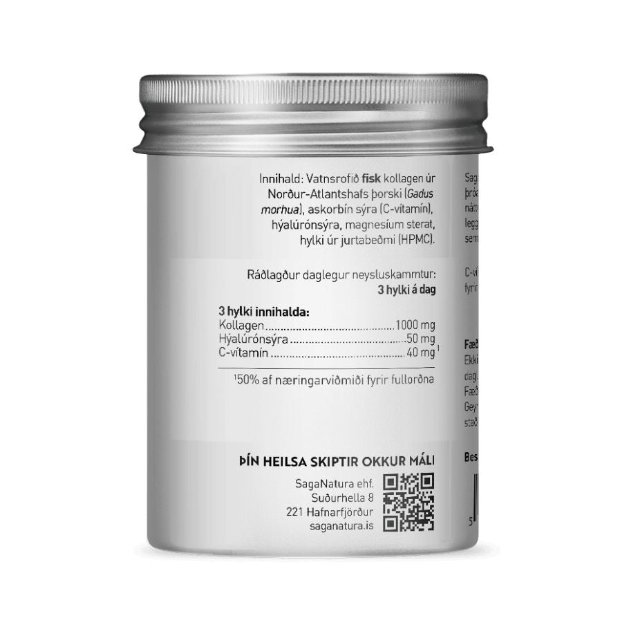 Kollagenið frá Saga Natura er unnið úr þorskroði. Þorskurinn er veiddur í Norður-Atlantshafi. Inniheldur einnig hýalúronsýru og C – vítamín sem stuðlar að myndun kollagens fyrir eðlilega starfsemi húðar.