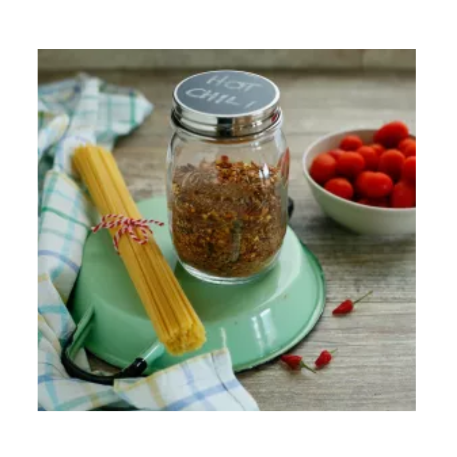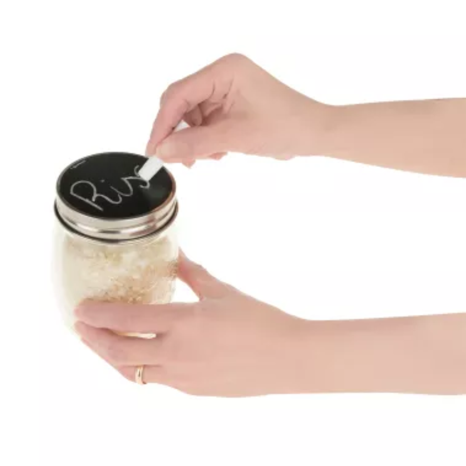 Lok með krítaráferð sem gerir þér kleift að skrifa innihald krukkunnar eða dagsetningu á lokið. Krít fylgir með.