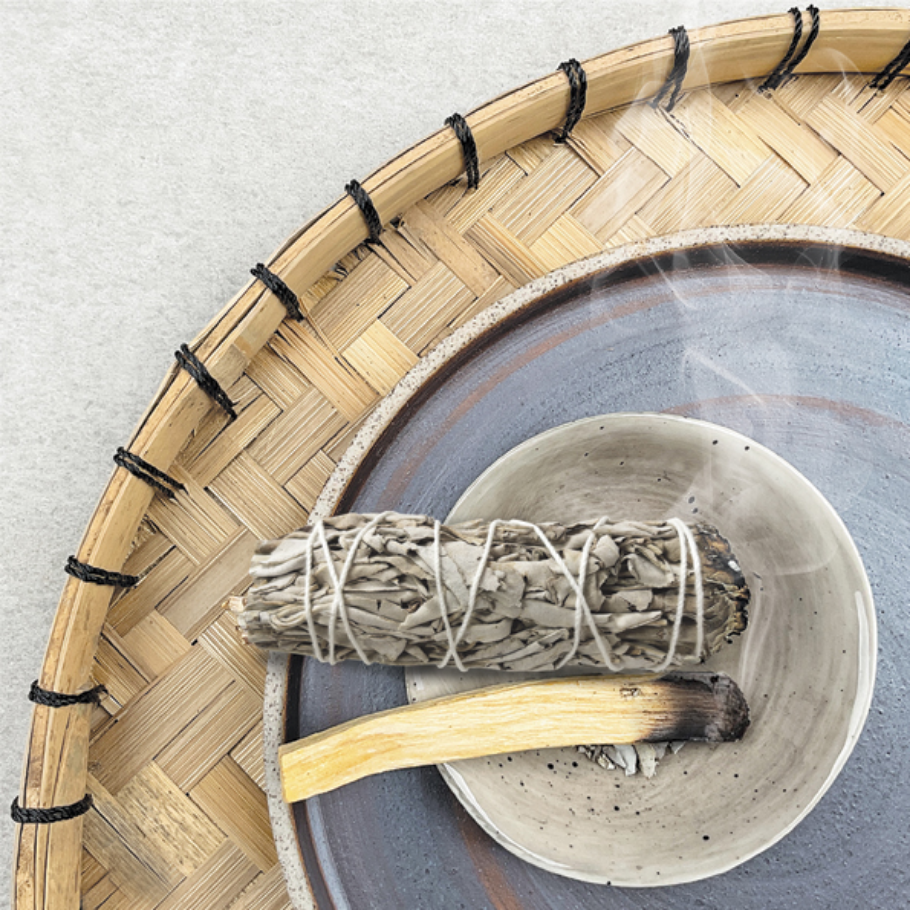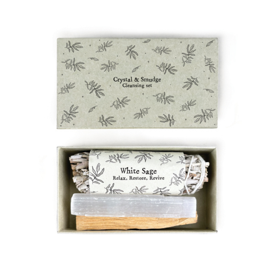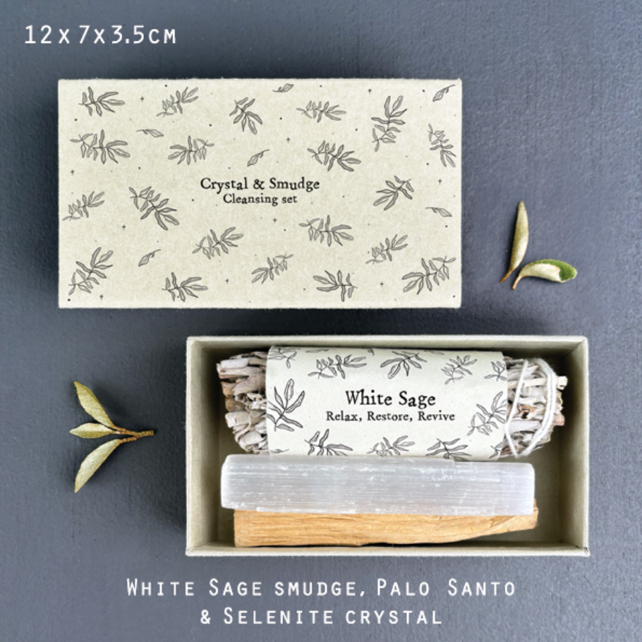 Inniheldur selenít kristal, lítinn salvíuvönd og palo santo við.
