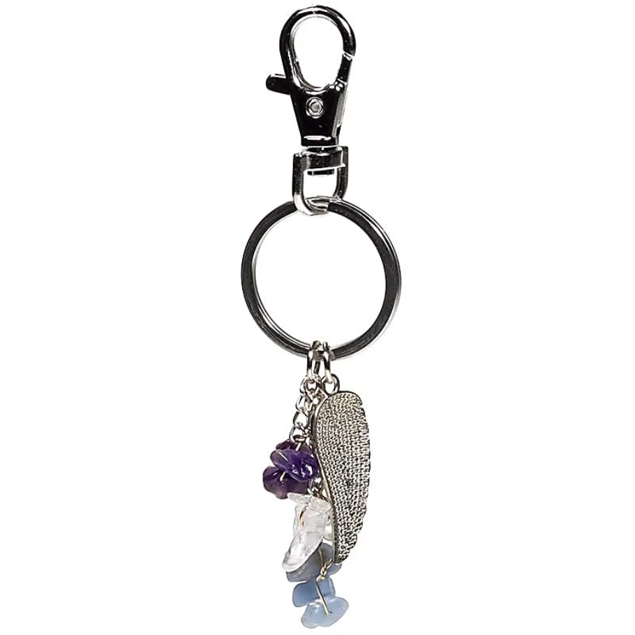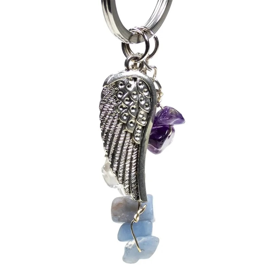 Fínleg lyklakippa með englavæng og amethyst, bergkristal og angelite kristöllum