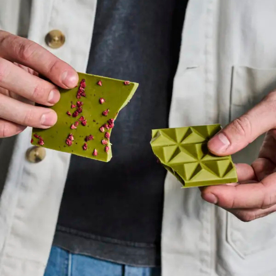 Ljúfengt bragðið af þessu handgerða hvíta matcha súkkulaði, sem þó er grænt, verður til með fullkominni blöndu af Moya Matcha Daily te, hindberjum og kakóbaunasmjöri. Við elskum þetta súkkulaði eiginlega aðeins of mikið og á matchakeimurinn þar stóran þátt í því. Bragðið af matcha er þó alls ekki yfirgnæfandi og sætleiki súkkulaðisins passlegur og í jafnvægi við matchabragðið, en súkkulaðihandverksmenn La Naya verksmiðjunnar spara ekki matcha í framleiðslu á þessum gullfallegu súkkulaðiplötum. Þurrkuðu villtu hindberin gefa súkkulaðinu lúmskt súrsætt ávaxtabragð sem setur algjörlega punktinn yfir i-ið.