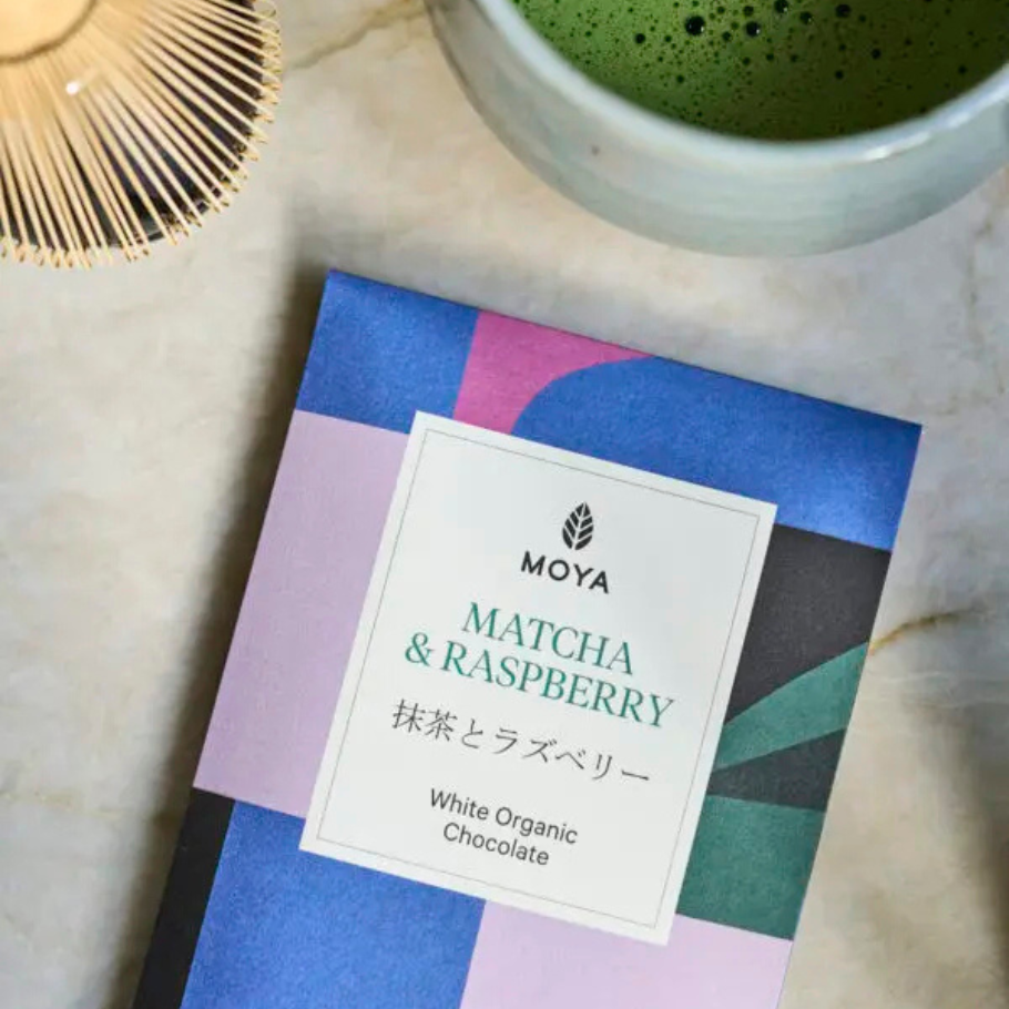 Innihald: Moya matcha daily (2,5%) kakósmjör, sykur, undanrennuduft, frostþurrkuð hindber (1%), non gmo soyja lesitin, þurrt kakó – ekki minna en 40%.