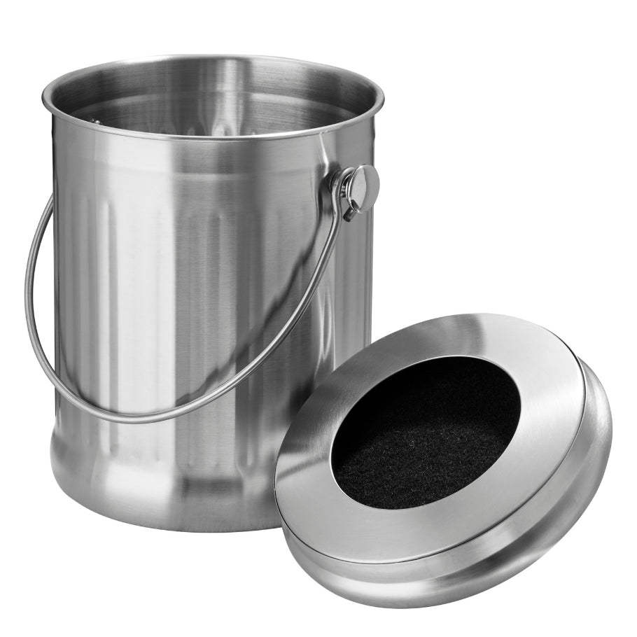 Pulito söfnunartunnan er til að safna saman matarleyfum í eldhúsinu þínu. Moltutunnan sem er með einfalda og fallega hönnun er úr stáli og sómir sér vel í hvaða eldhúsi sem er. Hún stendur vel á borði og er alltaf við höndina. Í lokinu eru tvær virkar kolasíur sem koma í veg fyrir flugur og vonda lykt. Þegar þú jarðgerir matarleyfar og annað sjálf/sjálfur í garðinum þínum minnkarðu heimilissorpið umtalsvert, eða allt að 20%. Lífræni úrgangurinn frá þínu heimili kemst þá aftur í hina náttúrulegu hringrás. Efni: Stál Stærð: Tunnan rúmar fjóra lítra. Hæð: 29 cm með loki, þvermál 18,5 cm. Umhirða: Má fara í uppþvottavél, fjarlægið filter úr loki áður. Mælt er með að skipta um síu á 6-12 mánaða fresti til að viðhalda hámarks virkni síunnar. LESA MEIRA HÉR. Framleitt í Kína FSC umbúðir