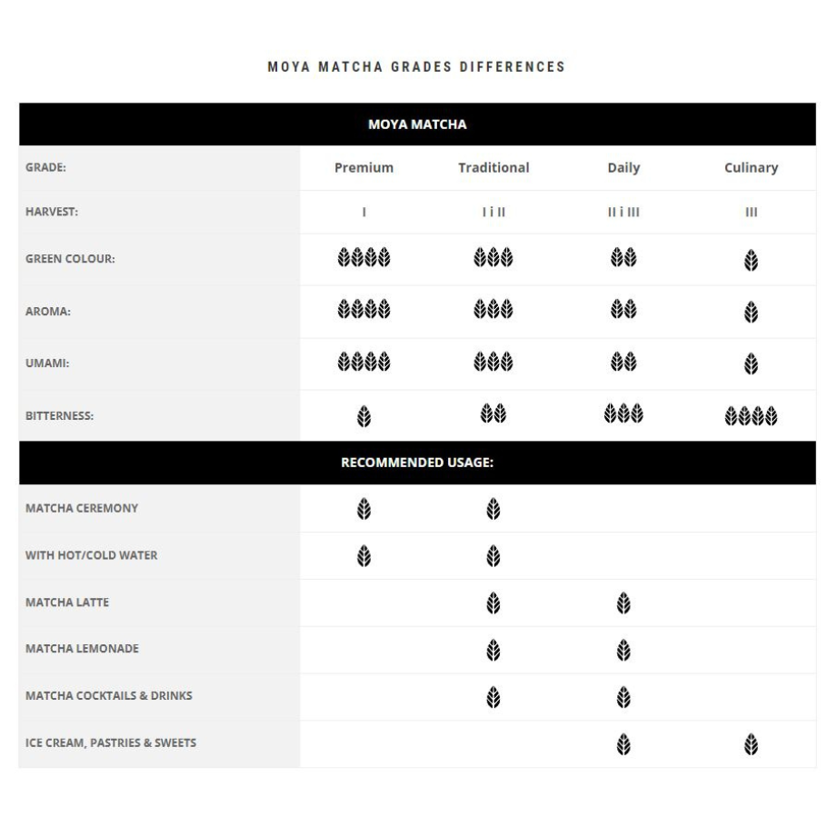 Moya matcha Daily fæst úr annarri og þriðju uppskeru úr teplöntum sem eru sérstaklega skyggðar fyrir beinu sólarljósi. Skyggingin leiðir til hærri blaðgrænu og L-Theanine innihalds og ríkari grænum lit. Fersku laufunum er síðan safnað saman, þau þurrkuð og möluð í duft. Moya matcha Daily hefur sterkt grænt tebrað og langvarandi eftirkeim. Það má útbúa með hefðbundnum hætti í matcha skál eða einfaldlega í hristara. Um Moya matcha Moya Matcha Traditional er ræktað í Uji-héraði í Kyoto, en það er þekkt fyrir ræktun á hágæða grænu tei í yfir 800 ár. Uji-svæðið er frægt fyrir frjósaman jarðveg og hreint vatn. Grænu teplönturnar þar búa við kjöraðstæður til vaxtar þökk sé hæðum sem veita gott sólarljós og algengs þokumisturs sem verja viðkvæm blöð fyrir frosti og mikilli úrkomu. Moya Matcha er vandlega ræktað og uppskorið á litlum lífrænum teökrum í eigu hverra fjölskyldu. Það er síðan unnið á staðnum í Japan og sent í litlum lotum til að tryggja hámarks ferskleika fyrir allar tegundirnar okkar. Þetta hjálpar til við að varðveita alla eiginleika teblaðsins og viðhalda miklu magni steinefna og andoxunarefna.