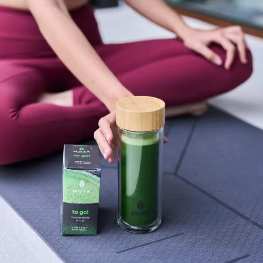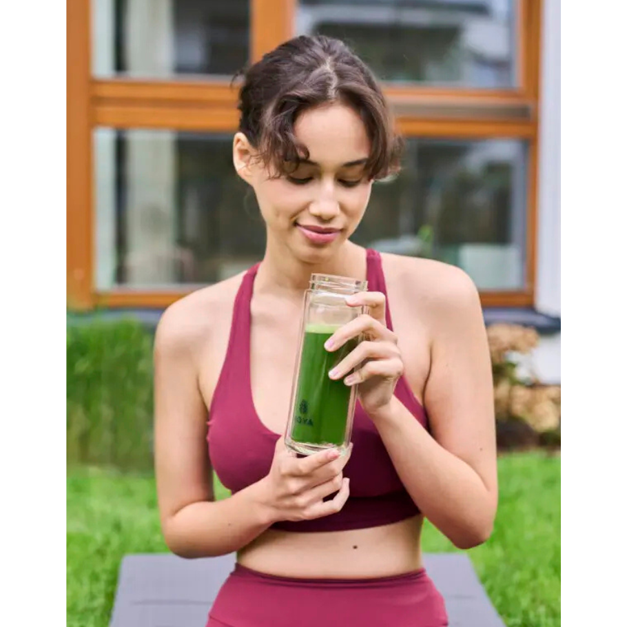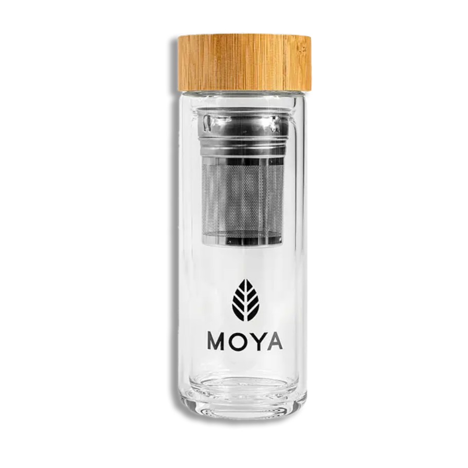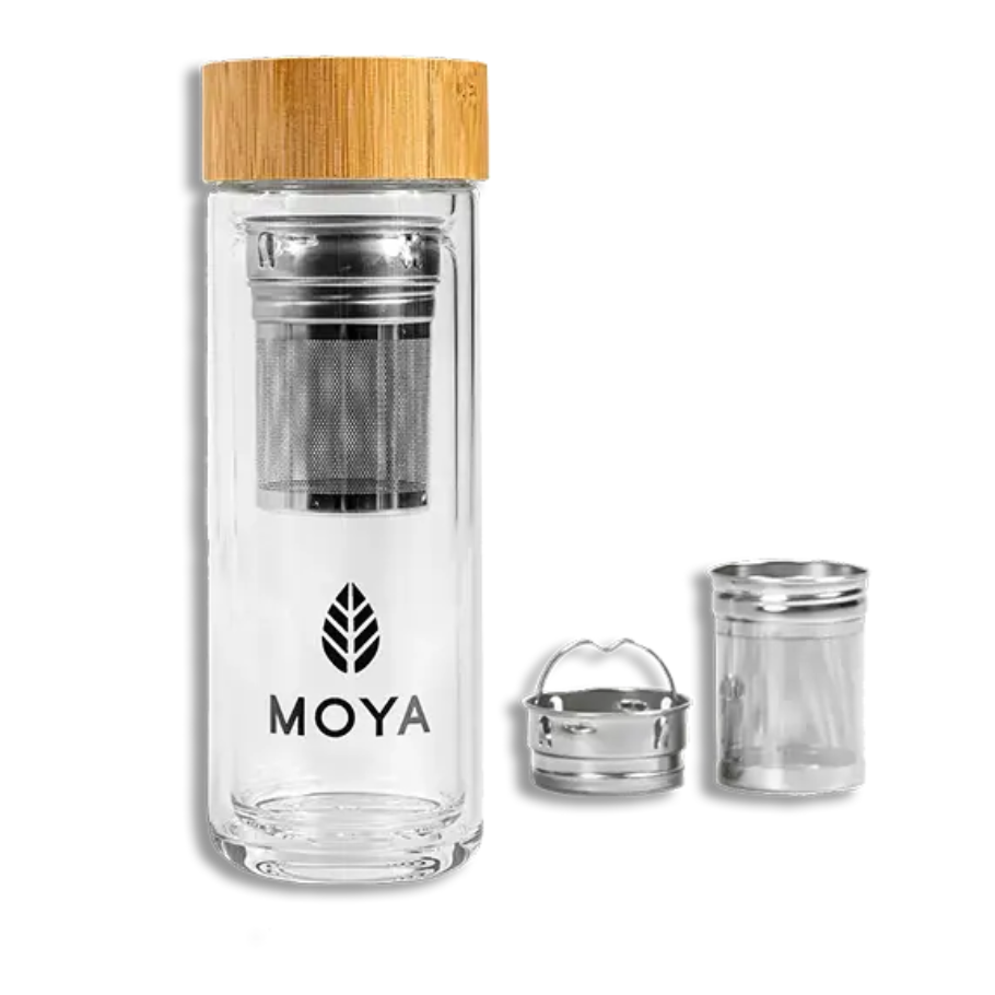 Gullfalleg 320 ml. drykkjarflaska með tvöföldu gleri og þéttu bambusloki fyrir girnilegu og hollu drykkina þína. Hentugt fyrir te (bæði laufte og matcha te), niðurskorna ávexti, grænmeti eða ber. Þú ákveður hversu lengi þú lætur bragðgjafann liggja í flöskunni og notar til þess aðra hvora síuna, en tvær síur, mislangar fylgja með.
