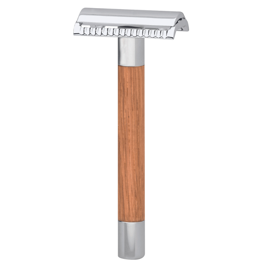 Lúxus öryggisrakvél með fallegu eikarhandfangi.