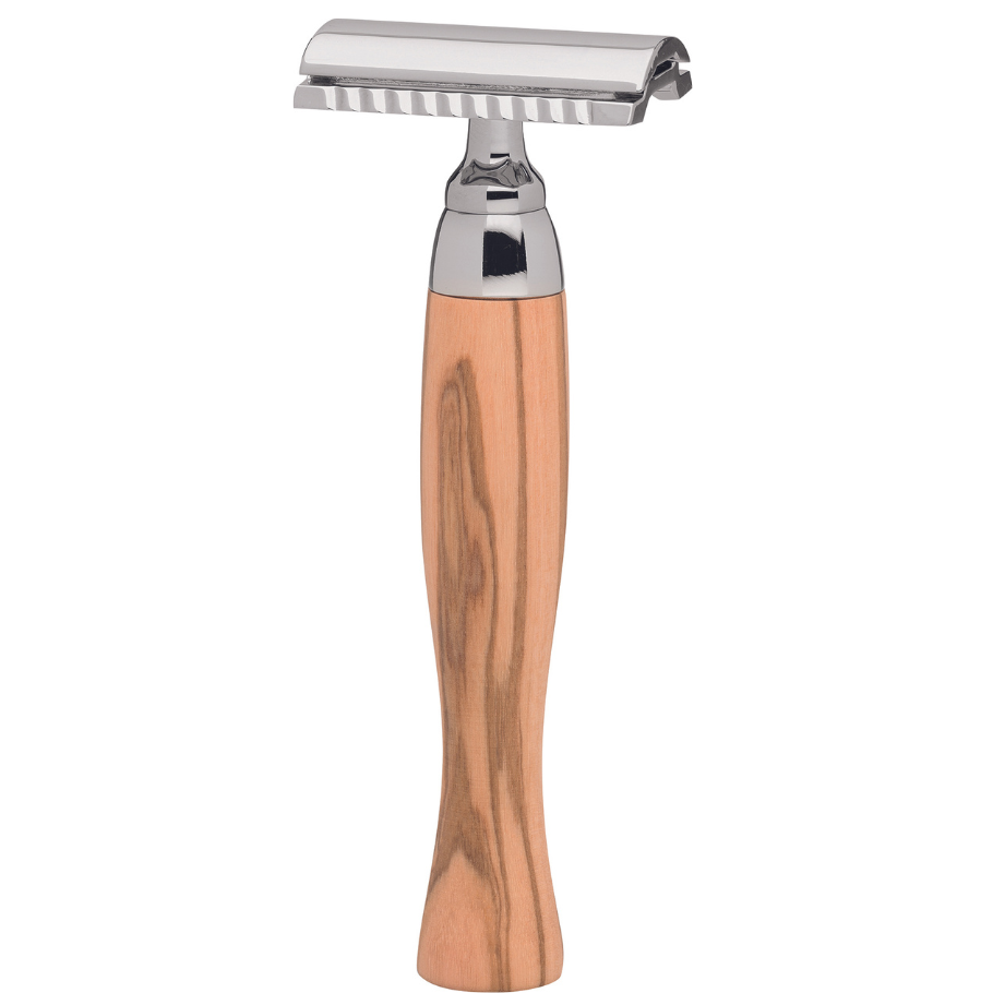 Hefðbundin öryggisrakvél með handfangi úr fallegum ólífuvið sem er dásamlega mjúk í hendi.
