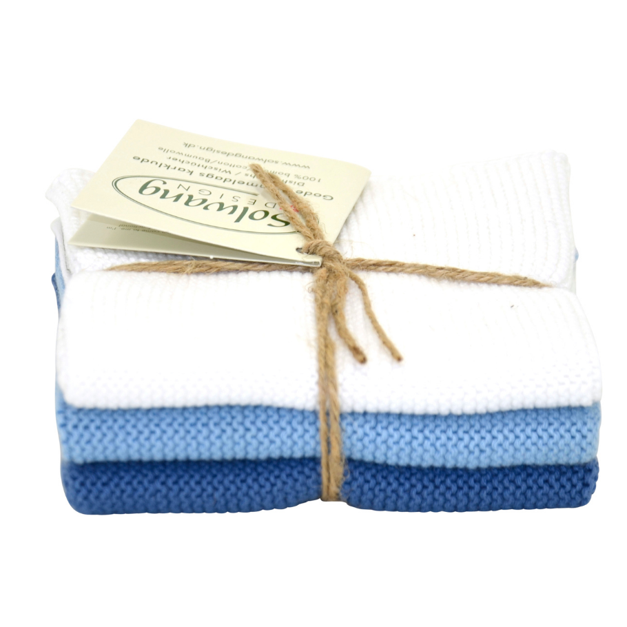 Solwang prjónuð borðtuska, hvítt-blátt kombó 25x25 cm. 3 stk.
