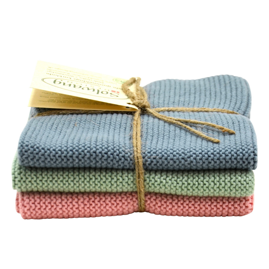 Solwang prjónuð borðtuska, antik bleikt, grænt, blátt 25x25 cm. 3 stk.