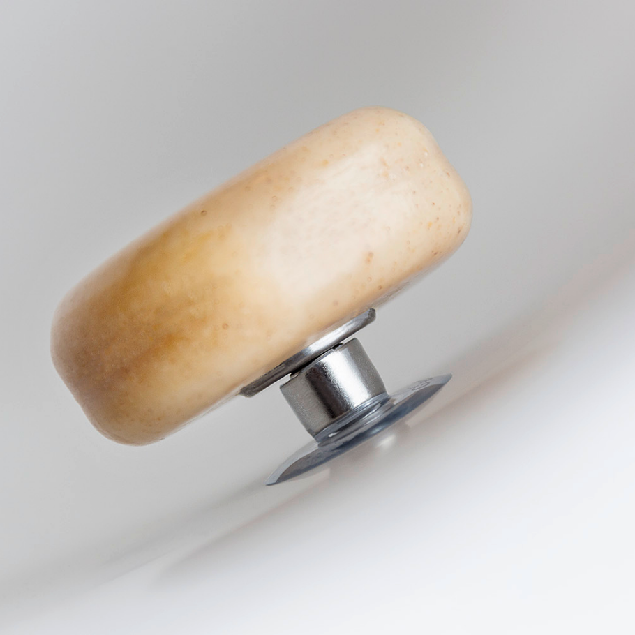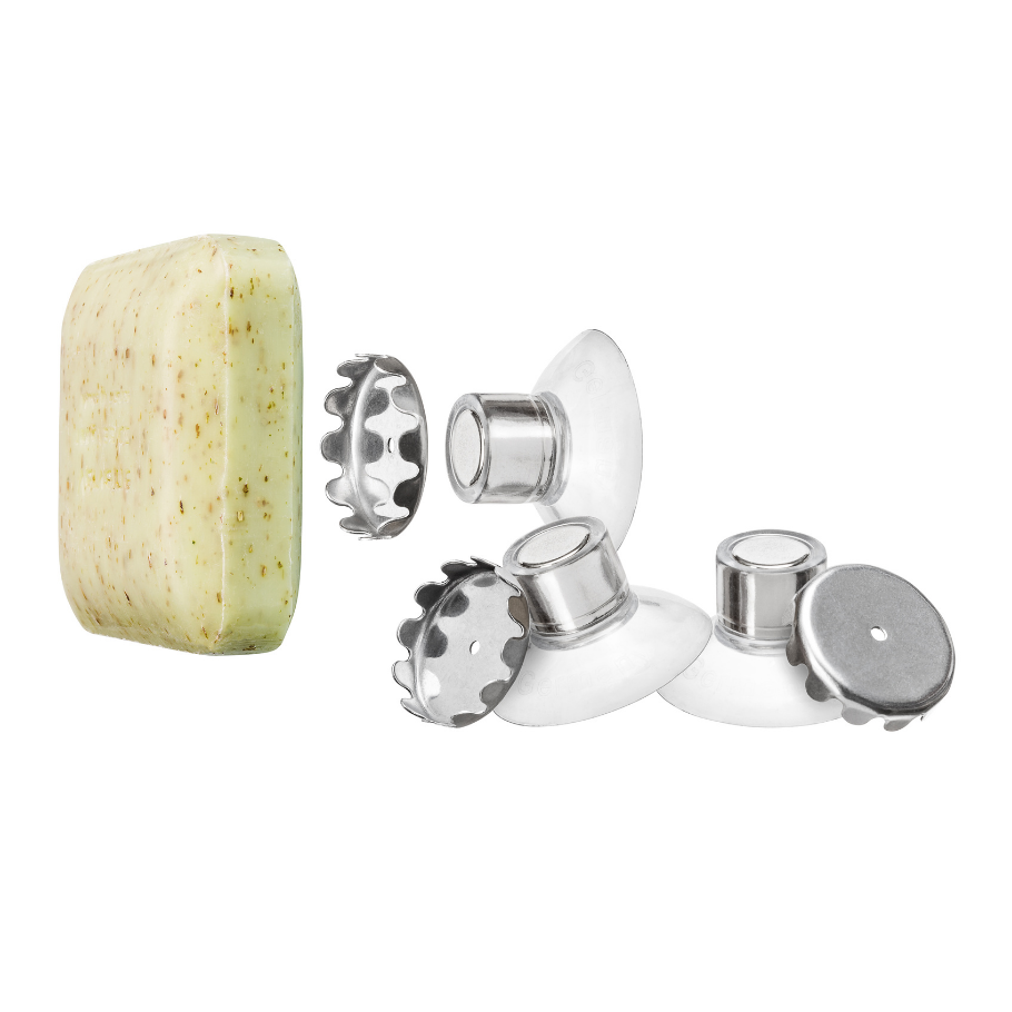 Sápusegullinn er einstaklega hentugur í notkun og kemur í tveimur pörtum. Annar parturinn er sogskál úr silikoni sem þú festir innan í vaskinn og hinn er segull sem þú setur í sápuna.