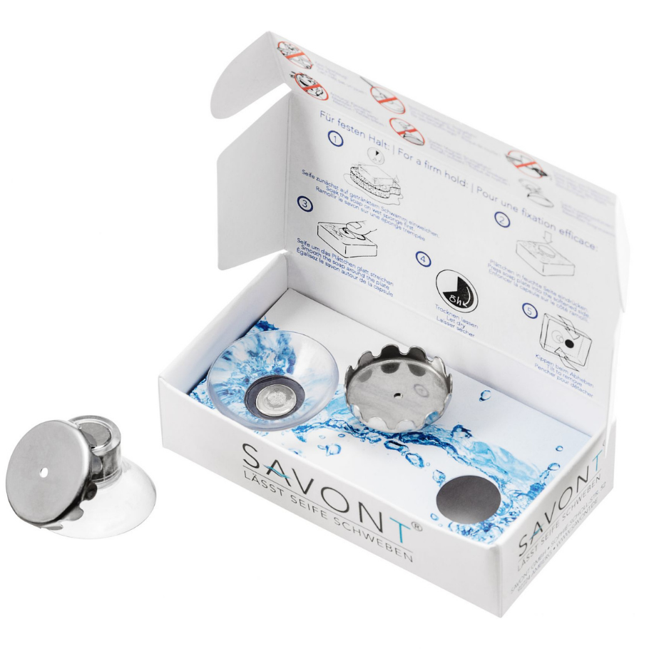 Hreinsaðu þann flöt sem þú vilt staðsetja sápuna á og festu sogskálina þar á. Segulinn setur þú í sápuna. Ef sápan er mjög hörð er ráðlagt að leggja hana á blautt stykki í 1-2 klst. til að mýkja hana aðeins og setja svo segulinn í og láta sápuna þorna.