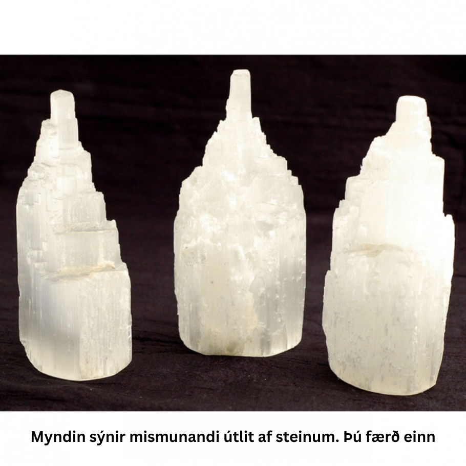 Útlit selenite turnanna getur verið aðeins mismunandi þar sem þetta er náttúrulegur kristall en hæðin er yfirleitt á bilinu 9 - 11 cm.