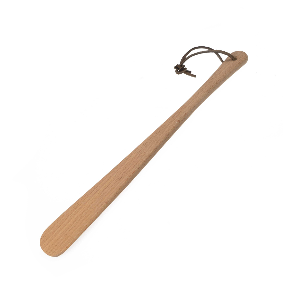 Fallegt, langt skóhorn úr ómeðhöndluðu beyki með leðuról til að hengja það upp.