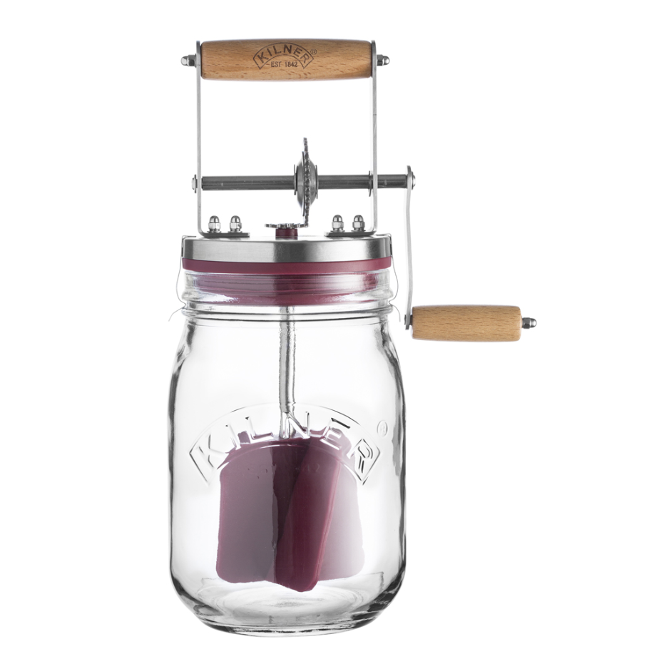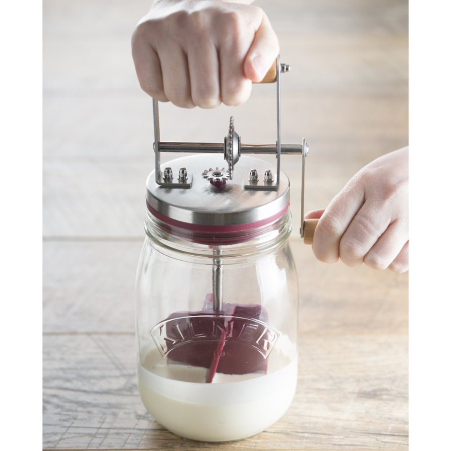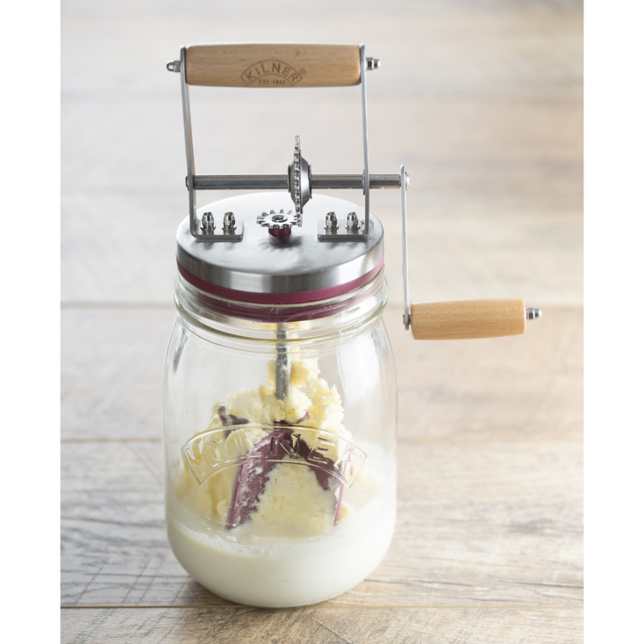Nú er ekkert mál að búa til sitt eigið smjör. Setjið einfaldlega rjóma í glerkrukkuna, setjið lokið með þeytaranum á krukkuna og snúið handfanginu þannig að spaðarnir byrji að snúast. Haldið áfram að þeyta í um það bil 10 mínútur eða þar til þið sjáið að smjörklumpur er byrjaður að myndast. Þá er vökvinn síaður frá og smjörklumpurinn mótaður til og settur í smjörkúpu. Einnig má bæta kryddjurtum út í eftir smekk.