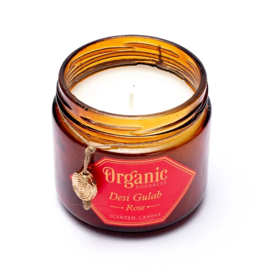 Handgerð kerti frá Organic Goodness úr náttúrulegu sojavaxi og rósailmi. Þráðurinn er úr blýlausum bómullarþráð og því fara eiturefni ekki út í andrúmsloftið við bruna en brennslutími kertisins er allt að 55 klukkustundir.
