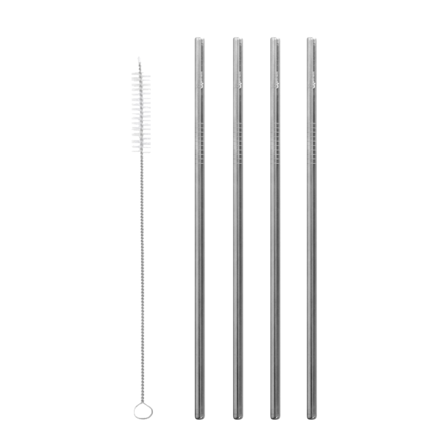 Fjögur margnota bein stálrör með bursta til að þrífa rörin eftir notkun.