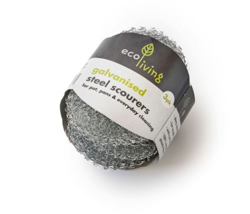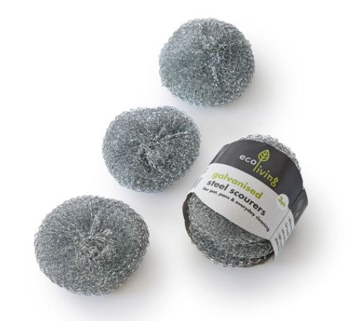 Í þessum pakka eru þrír skrúbbar úr níðsterku galvaniseruðu stáli sem nota má aftur og aftur þangað til dagar þess eru taldir og þeir fara í málmgáminn. Notið á sama hátt og svamp á mjög erfið svæði t.d. í pottum og pönnum eða öðrum svæðum. Varist þó að nota skrúbbana á húðaða fleti. (non stick)