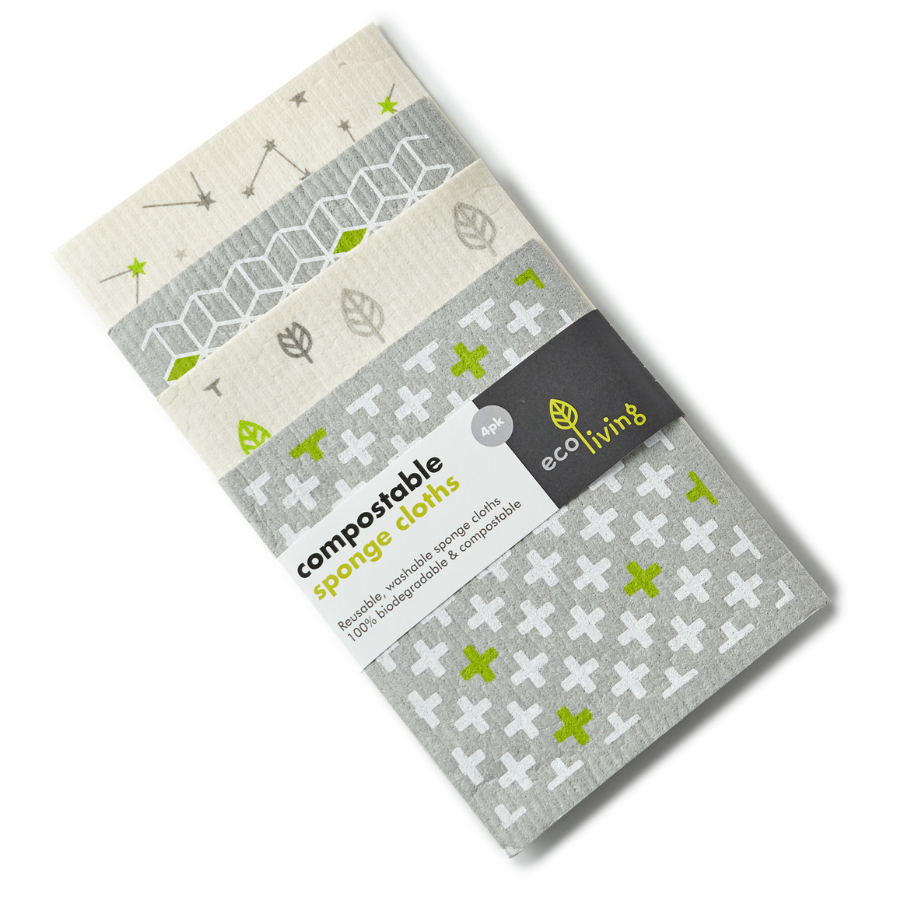 Svampklútar úr 70% sellulósa og 30% bómull og áprentaðar með vatnsbaserðum prentlit. Klútarnir láta ekki frá sér mikróplastagnir eins og hefðbundnir plastsvampar. Svampklútarnir eru mjög rakadrægir, endingargóðir og margnota. Mega fara í heimamoltu þegar líftíma þeirra lýkur.