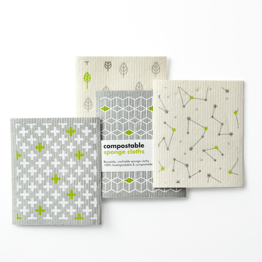 Sett af jarðgerðanlegum svampklútum með krúttlegu mynstri.