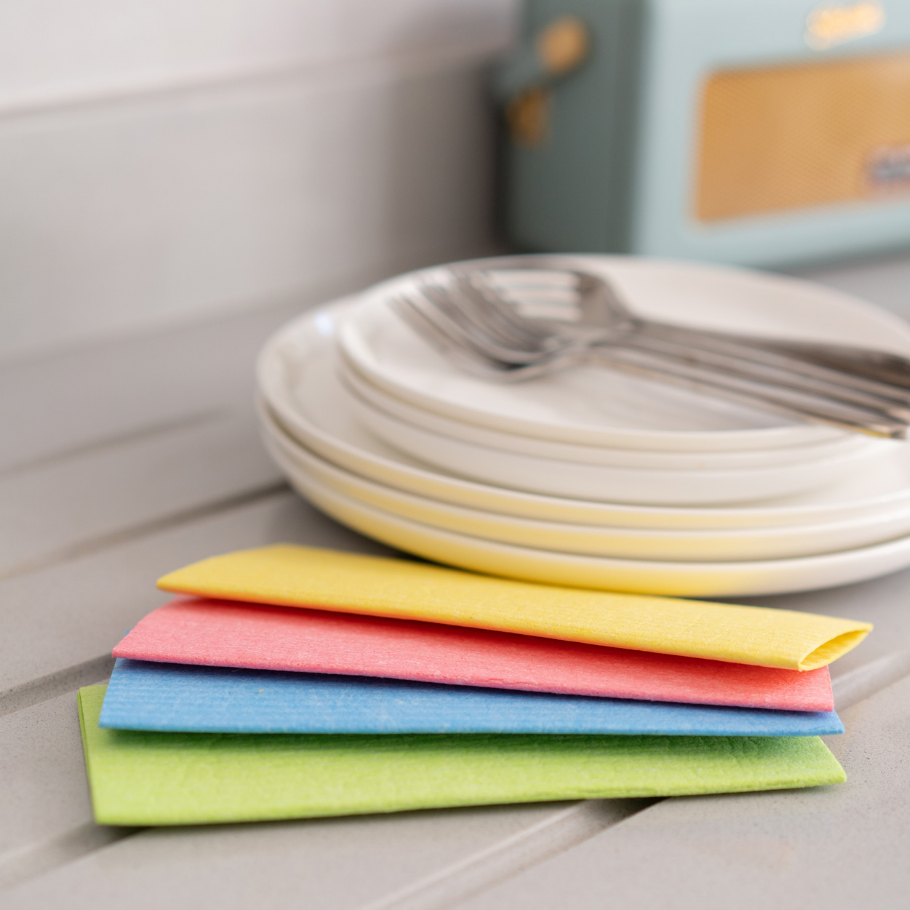 Sett af jarðgerðanlegum svampklútum í öllum regnbogans litum..