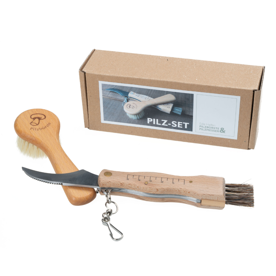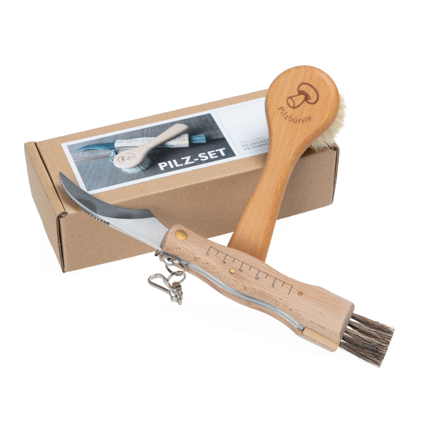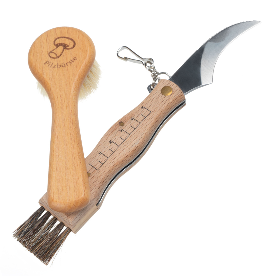 Verklegur sveppahnífur úr olíubornu beyki og hnífur úr ryðfríu stáli. Hnífsblaðið fellur inn í haldfangið og hvílir í stálumgjörð. Á hnífnum er 5 cm. mælistika, flísatöng til að kroppa óhreinindi úr fönum eða pípum og hægt er að hengja hnífinn í belti. Á hnífnum eru jafnframt nokkur burstahár. Auk þess fylgir lítill sveppabursti sem auðveldar þrifin til muna.