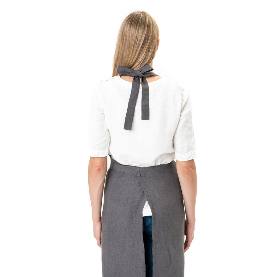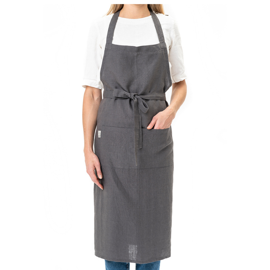 Stílhrein og hentug svunta úr hör sem er bundin um háls og mitti, með smekk og tvískiptum vasa að framan. Hentar vel í eldhúsið, gróðurhúsið eða annarsstaðar þar sem eitthvað er verið að bardúsa til að vernda fatnað. Hör er endingargott efni, rakadrjúgt og auðvelt í umhirðu. Unisex snið