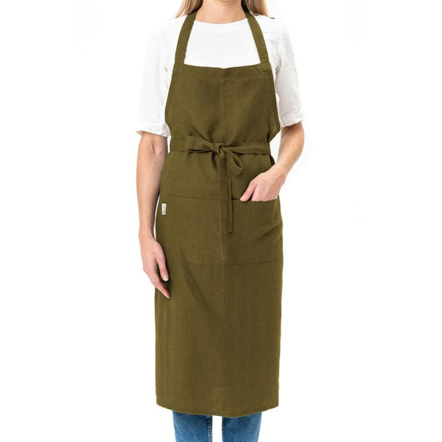 Stílhrein og hentug svunta úr hör sem er bundin um háls og mitti, með smekk og tvískiptum vasa að framan. Hentar vel í eldhúsið, gróðurhúsið eða annarsstaðar þar sem eitthvað er verið að bardúsa til að vernda fatnað. Hör er endingargott efni, rakadrjúgt og auðvelt í umhirðu. Unisex snið