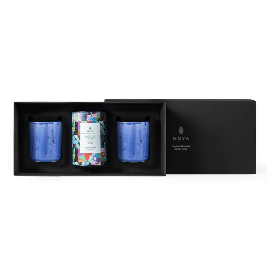 Tesett í fallegri gjafaöskju sem inniheldur Sencha te og tvo handgerða leirbolla. ATH. bollarnir eru ekki blái eins og á myndinni heldur ljósir.