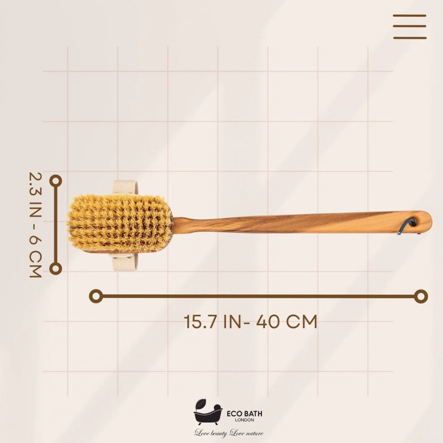 Dekraðu við húðina með Lúxus húðbursta frá Eco Bath London. Burstinn er búin til úr fallegum ólífuvið og er með náttúrulegum stífum sísal hárum. Þessi bursti er hannaður fyrir þá sem vilja aðeins það besta í húðumhirðu líkamans.