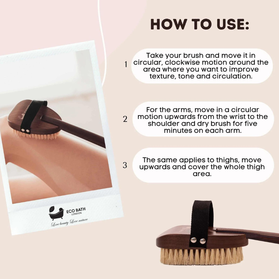 Til að ná bestum og sjáanlegum árangri er mælt með að þurrbursta húðina ca þrisvar sinnum í viku í ca 5 mínútur í senn. Burstið þurra húð og byrjaðu á fótunum og fikraðu þig uppá við og burstaðu alltaf í átt að hjartanu. Notaðu stuttar strokur og ekki nota mikið afl svo að þú særir ekki húðina. Mælt er með hringlaga strokum á magasvæði og handakrika. Burstaðu hendur frá fingrum og upp að öxlum með stuttum strokum. Dásamleg og náttúrleg aðferð sem hægt er að gera heima í rólegheitum og byrja daginn á smá dekri.